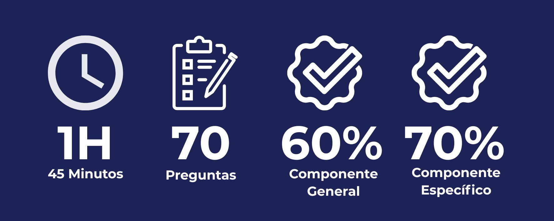 Los postulantes tendrán una hora con cuarenta y cinco minutos para desarrollar su examen, y se entenderá aprobado cuando se superen ambos componentes, obteniendo al menos un 60% de preguntas correctas en el componente general y un 70% en el componente específico.